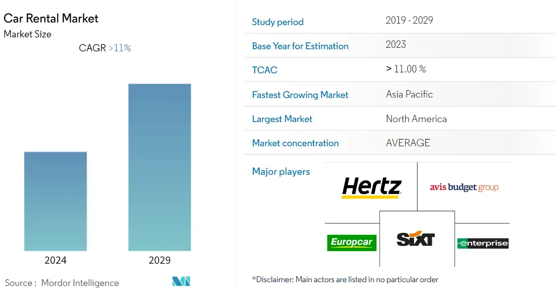 Mordor Intelligence Research & Advisory. (2023, June). Car Rental Market Size and Share Analysis – Growth Trends and Forecast (2024 – 2029). Mordor Intelligence. Retrieved September 12, 2024, from https://www.mordorintelligence.com/fr/industry-reports/car-rental-market